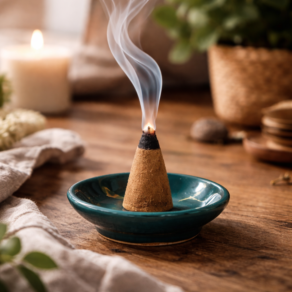 - Place the cone securely in the provided incense holder.
